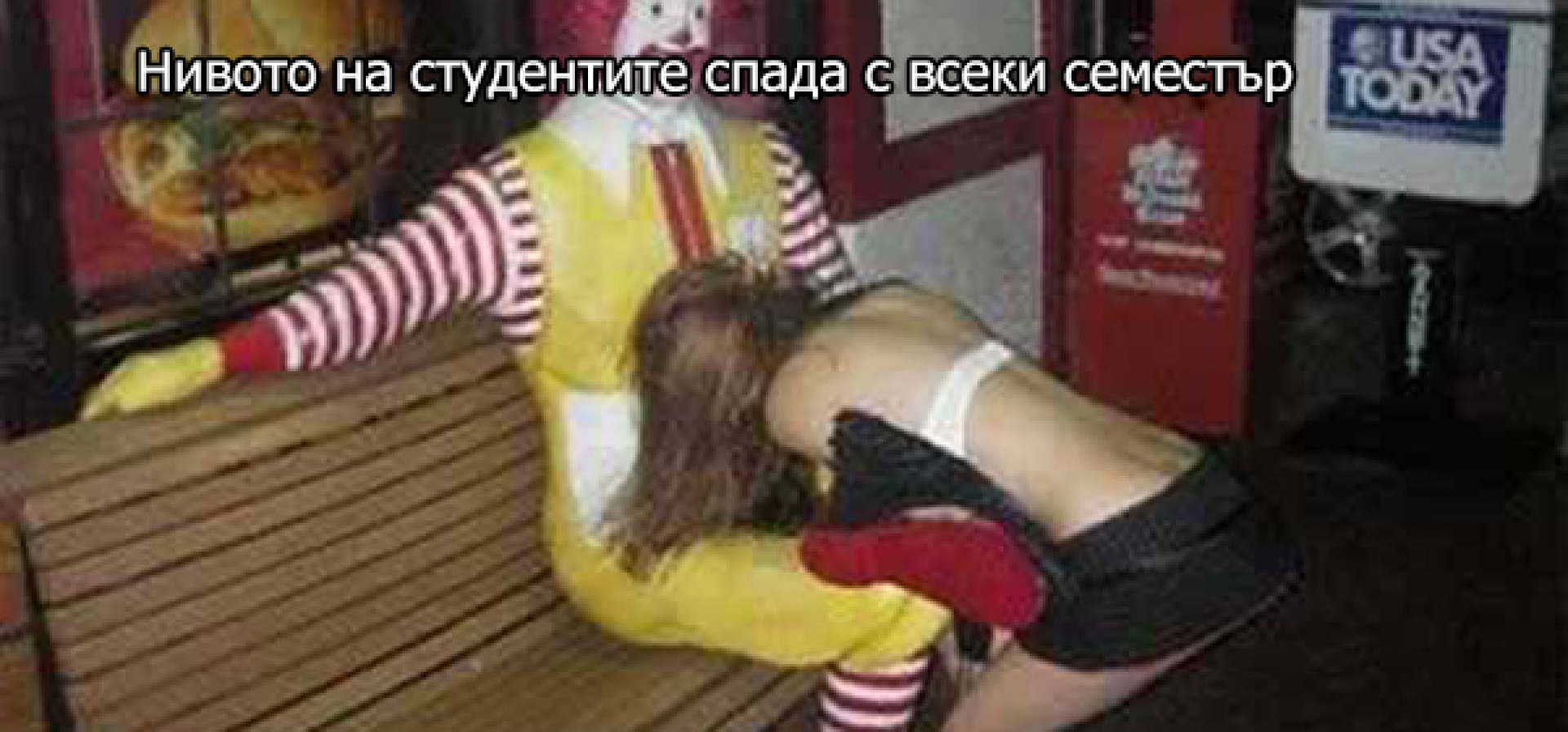 22-годишна третокурсничка в полуперспективна специалност е била скъсана на редовен изпит дори след възползване от опцията за повишаване на успеха с фелацио, а на поправителната сесия се е провалила също, оплакал се 58-годишен професор, възмутен от нарастващата некадърност на всяко следващо студентско поколение.