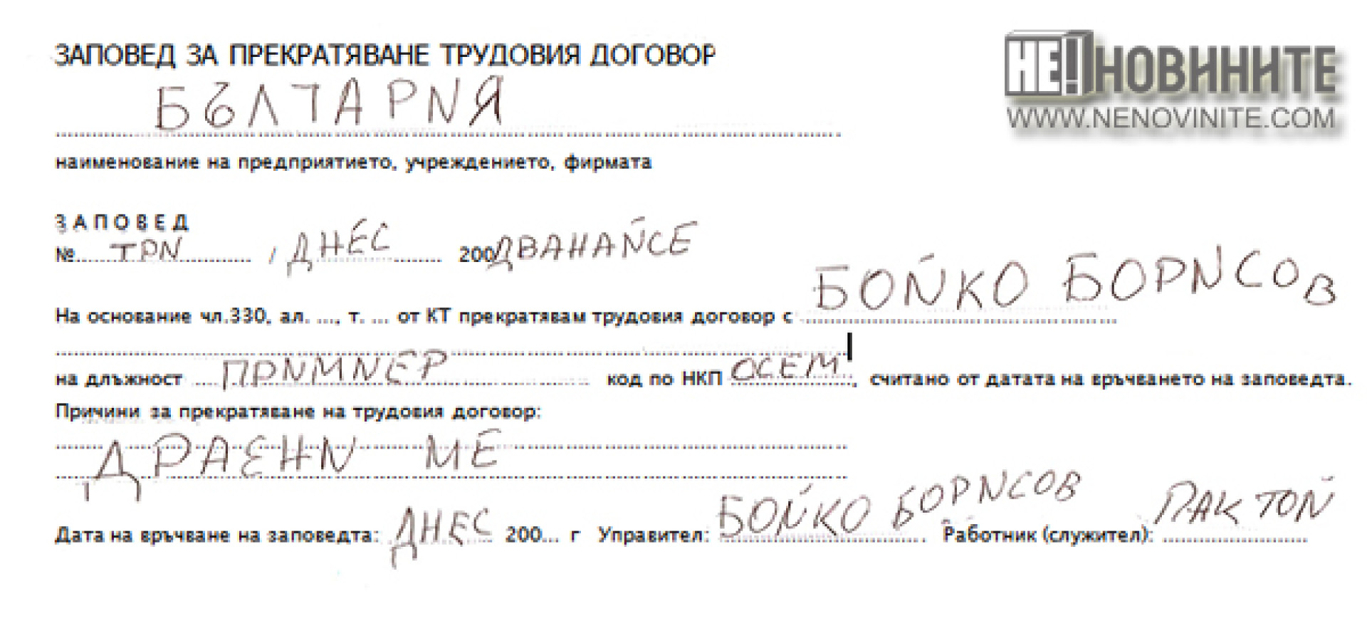 Бойко Борисов уволни себе си по-рано днес, като от кабинета му обявиха, че вероятно става въпрос за грешка, тъй като министър-председателят е особено зает с уволнения на хора през последните дни. Самата заповед за прекратяване на договора на Премиера изтече в медийното пространство (вж. снимката горе).