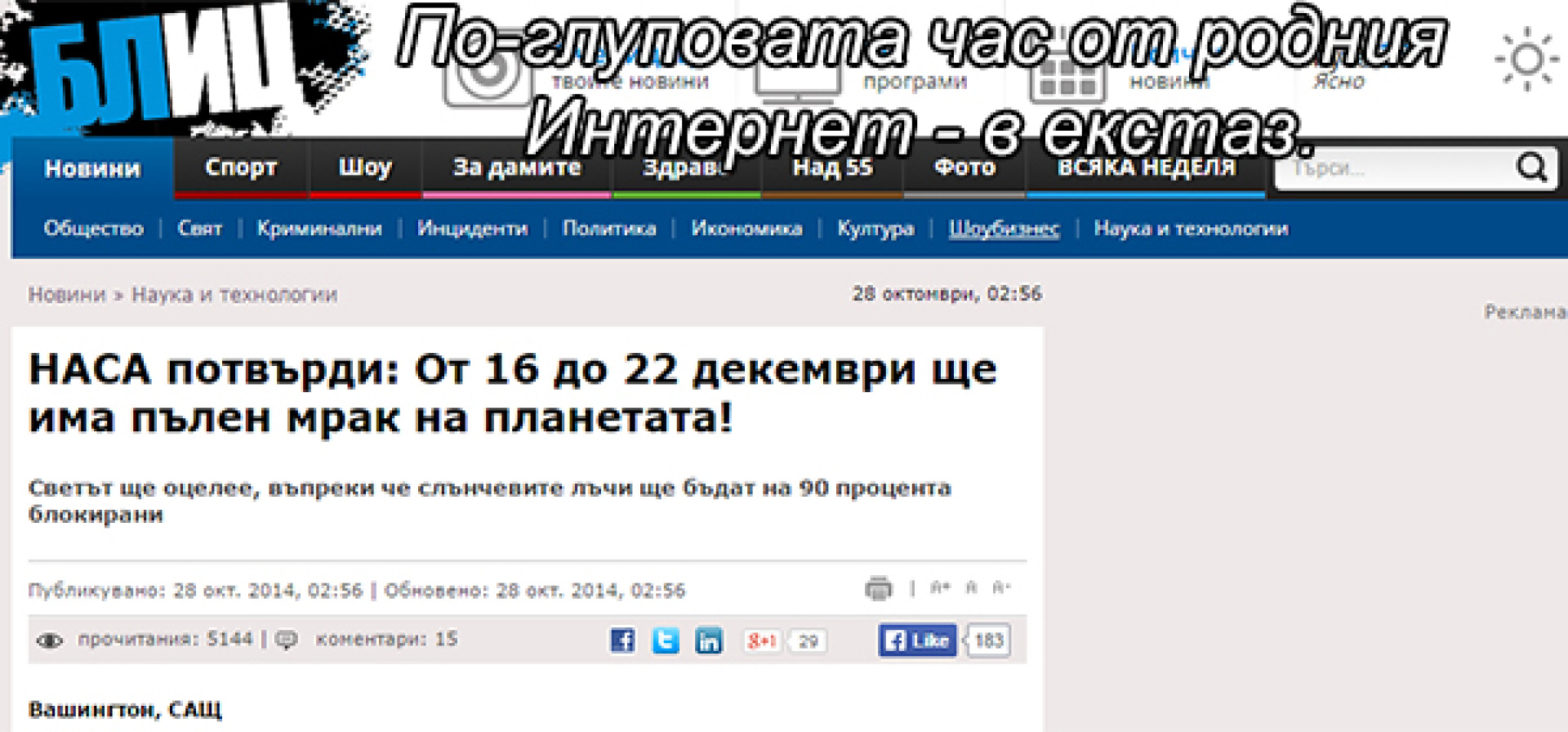 "Човечеството ще вярва на доста олигофренични информации от въпросната неделя до въпросната събота, благодарение на подредбата на Слънцето, което е зодия овен в трети дом на Луната, чието име ЛУНА (12-20-14-1) е сбор 45, което е абсолютна девятка и вие знаете какво е да си девятка с овен" - споделиха причините за предстоящия катаклизъм от НАСА.