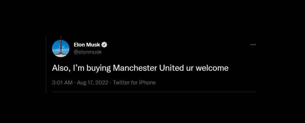 "След тоя фарс с Туитър аз вече съм гърмян заек. Исках да разбера колко от феновете на Манчестър (Юнайтед), които в момента изглеждат като пародия на Тотнъм, са истински и колко са от клик-ферми в Индия. Все пак едните ще си купят фанелки на Хари Магуаяр, а другите са прекалено интелигентни за такова нещо, защото са ботове" - обясни Мъск.