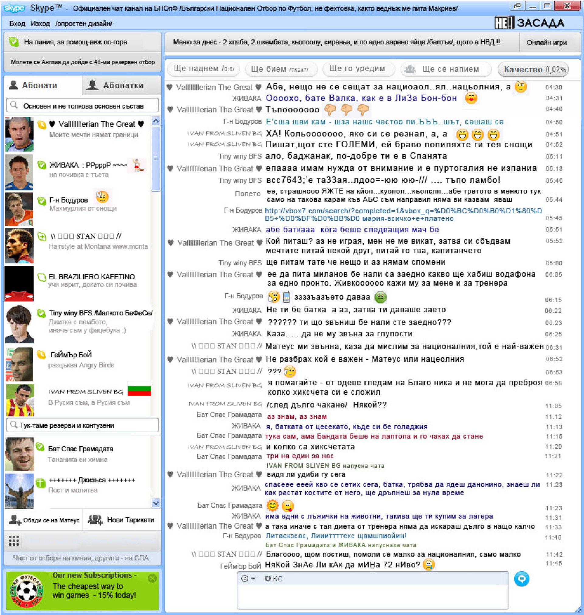 Нашият агент viper докладва за пореден път относно кореспонденциите на футболните хора в интеренета. Ето какво си пишат в тайния общ чат националите ни (