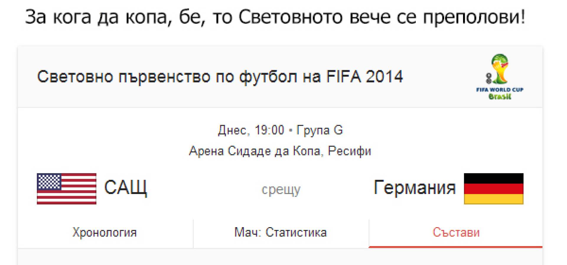 Днеска ще гледаме дали Германия ще зашлеви Големия брат или дружески ще завъртят един хикс, за да разреват Роналдо, защото какво Световно ще е, ако той не се разхлипа? Ще разберем веднага, след като видим чий химн пее Клинсман.
