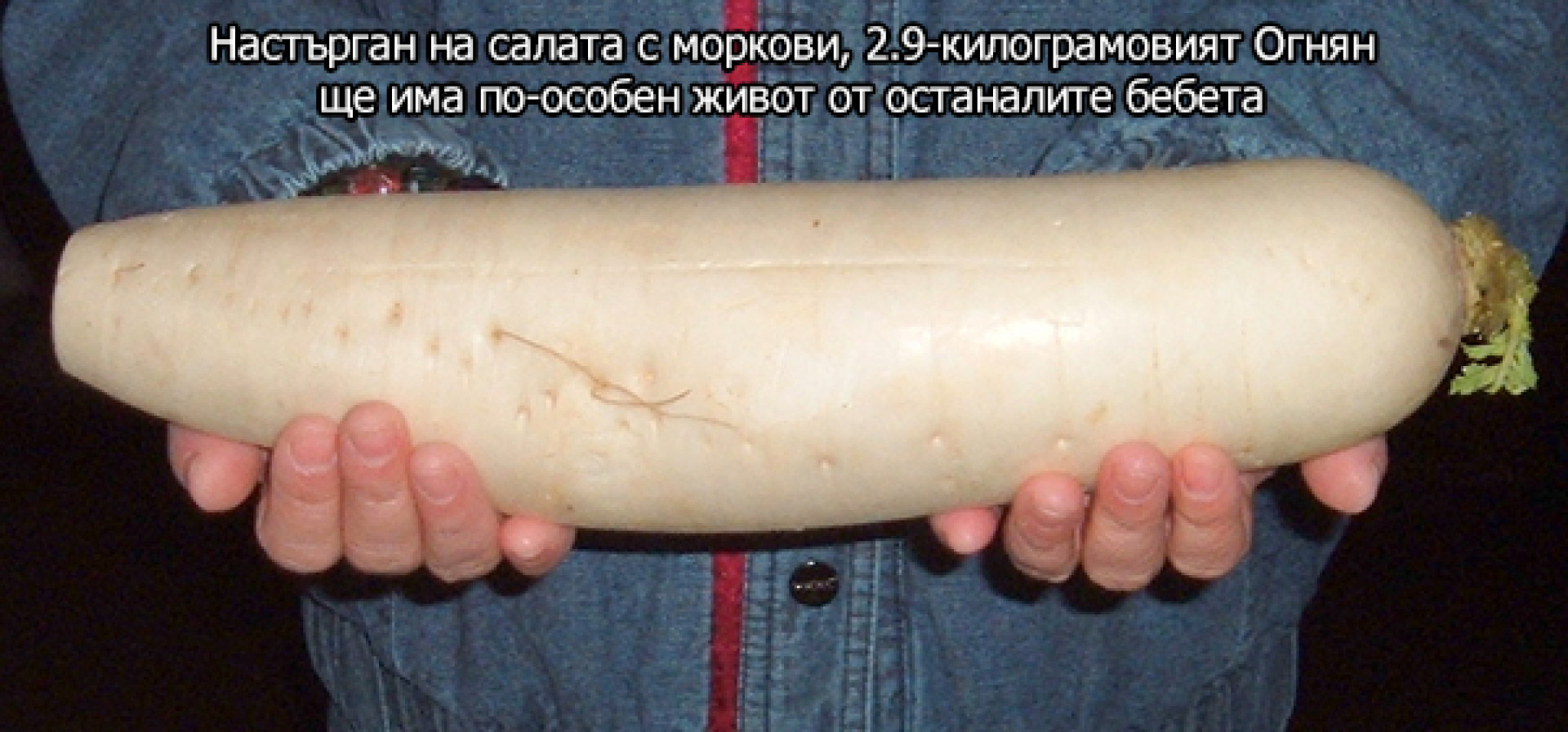 Бебето Огнян е родено по естествен път с 12 псувни от майка си и тежи 2.9 килограма, които са се запазили като тежест и в новата му форма на ряпа.