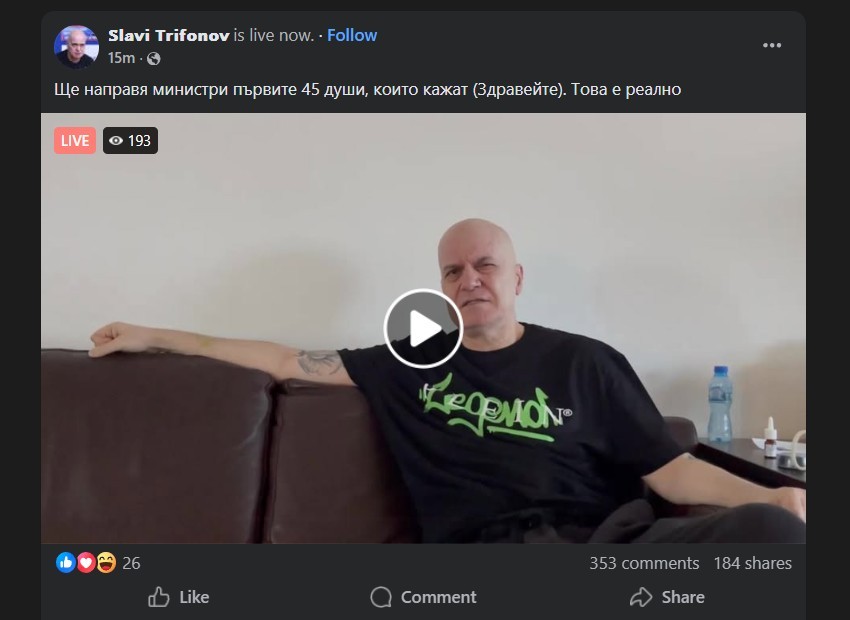 „Докато другите партии се чудят с кого да се коалират, ние работим с хората. Буквално. С тези, дето са онлайн по всяко време, щото нямат много за правене и не са канени на оргия или крадене“, обясни Трифонов логиката си.
