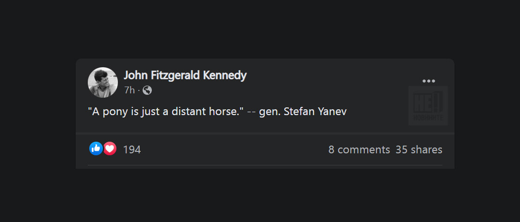 Генералът, вдъхновил избиратели с вкус, гласували преди доверие на РЗС, ББЦ и ВОЛЯ, сподели своето съмнение, че малките декоративни коне, известни като понита, съществуват. Според него те просто са много далеч и затова изглеждат малки.