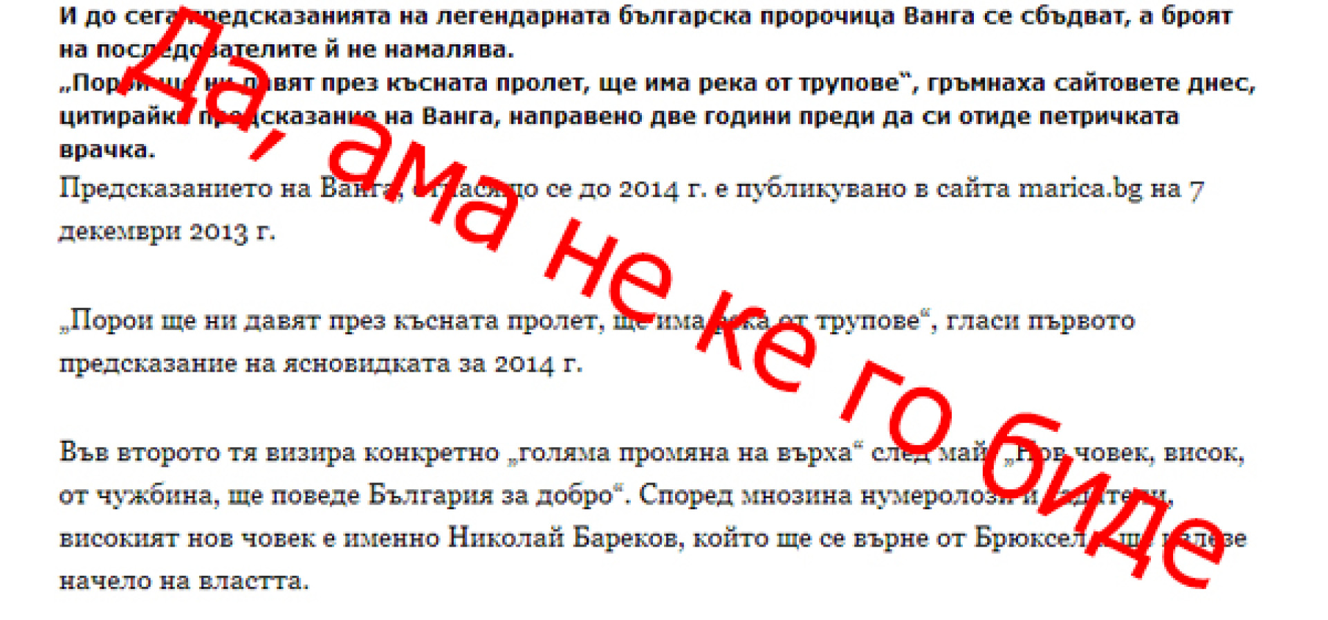 Говорителката на Ванга, Робева, обяви, че Бареков е предал доверието, което духовете са му гласували, и се е провалил в мисията си да спечели свобода за българския народ.