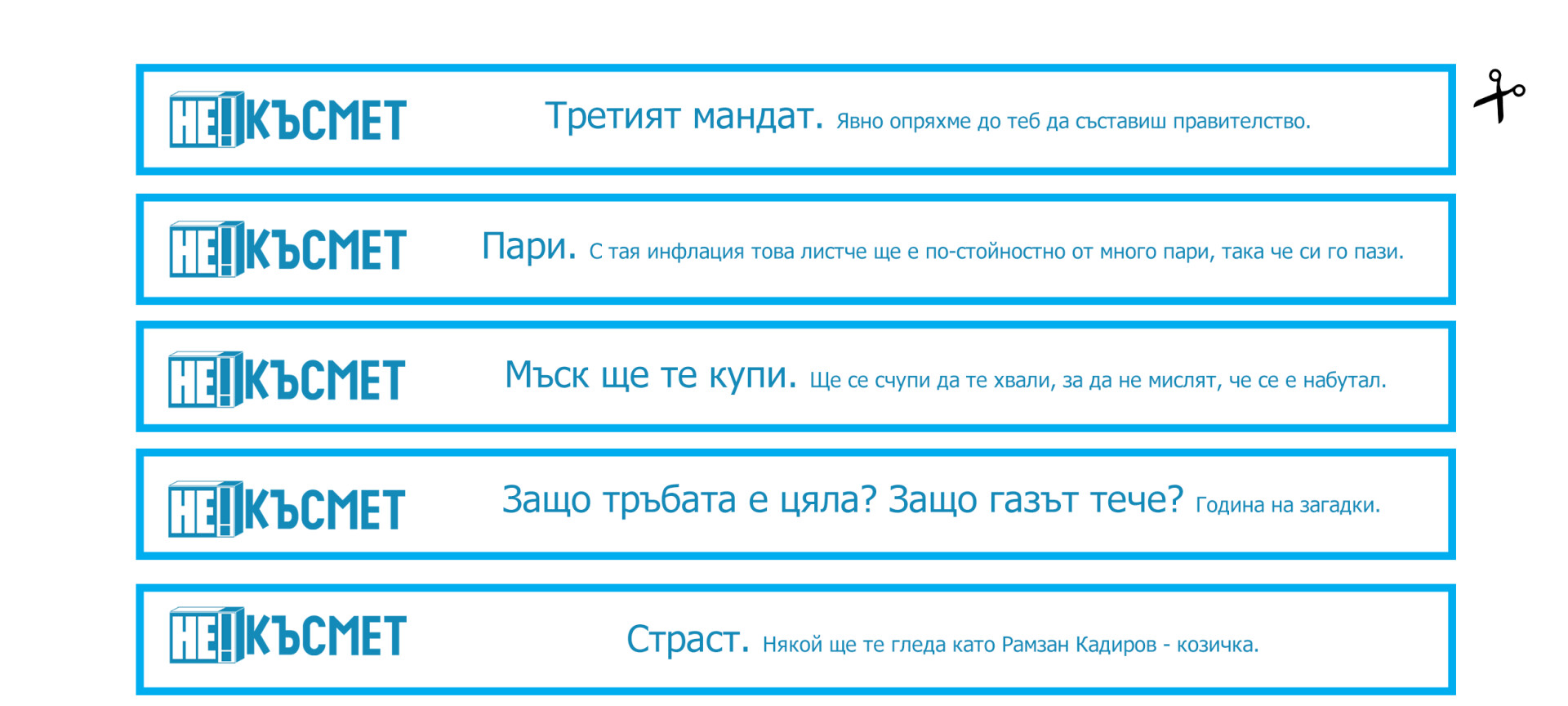 Баницата ви тръпне да я набамкате със станиолчета, защитаващи хумора от ново измерение, с който за поредна година Не!Новините ви дарява. Весело посрещане, изпращане, напиване и влизане в нов здравословен режим. Трябва да отслабнете, да поумнеете, да отплешивеете и евентуално да се родите наново, за да не допуснете грешките, които сте допускали досега. Дано ви се сбъднат радости през 2023, но това зависи от какъв ви е късмета.
