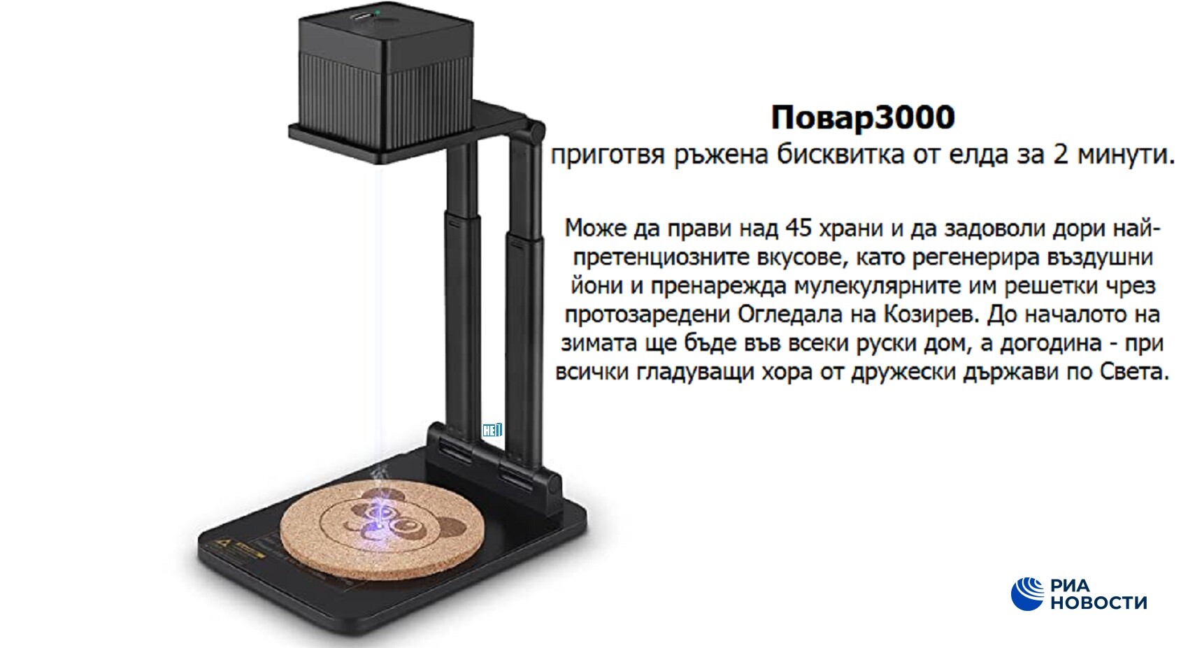 Уредът, създаден от най-доказаните научни светила в Руската федерация, може да генерира храна практически от въздуха, като се захранва с по-малко ток, отколкото хладилника, който се обезсмисля. Бащата на изобретението проф. Дмитрий Розанцев обяви край на световния глад, край на екологичния отпечатък от земеделието, свързан със сеч и отделяне на парникови газове, край на зависимостите от хранителни доставки в страни с неблагоприятен климат и край на транспорта на храни от единия до другия край на Света.