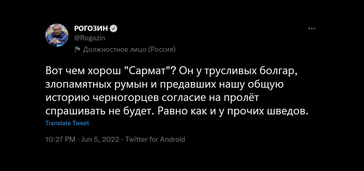 "От Мурманск до София ракетата е минала за 17 секунди, но за нещастие България е била въоръжена от НАТО със забранено оръжие за защита от високоточковите ни ракети. Това няма да свърши така" - сподели шефът на Роскосмос Димитри Рогозин между две глътки лакочистител.