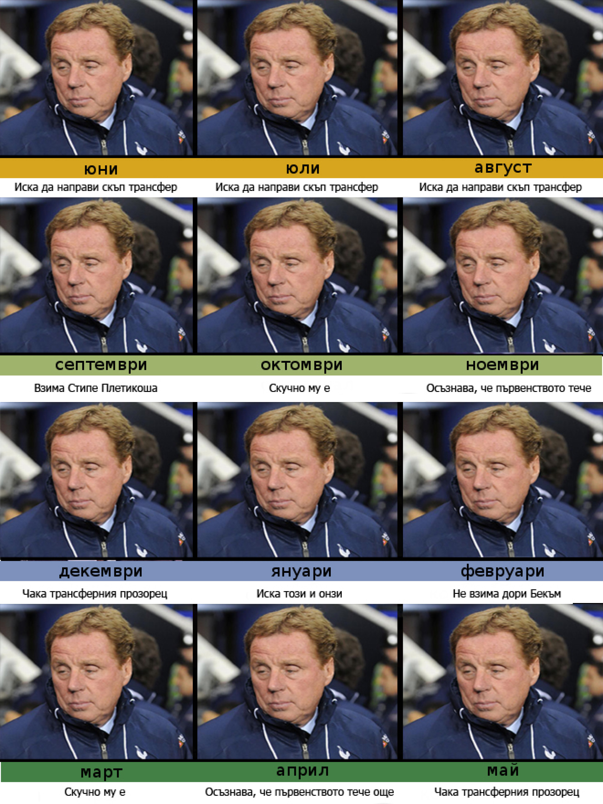'Ари е известен с това, че дойде ли трансферен прозорец полудява като жена в шопинг център, но почти никога не успява да си хареса играч (или да го купи). През останалото време Реднап е в дрямка.