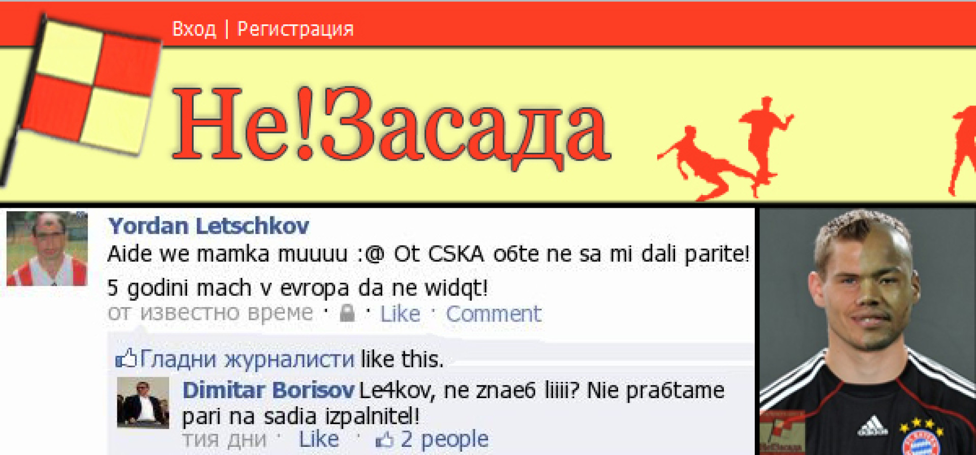 В Не!Засада ще може да следите вълненията, въжделенията и вижданията за играта с кожено кълбо, зелен килим и произволен брой ненужни халф-беци от страна на zhelyo, ще получите съвети как да изгубите най-драматично парите си чрез залози от наш нов специалист Joe T'aime, който се върна наскоро от Либия или Египет, където беше на професионална работа.