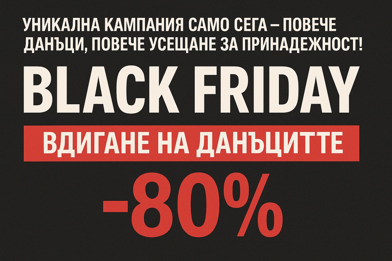 СТРАНАТА — С изключителен ентусиазъм Министерството на финансите обяви старта на Black Friday кампанията си за 2026 г., включваща лимитирано повишение на данъците до 80%.