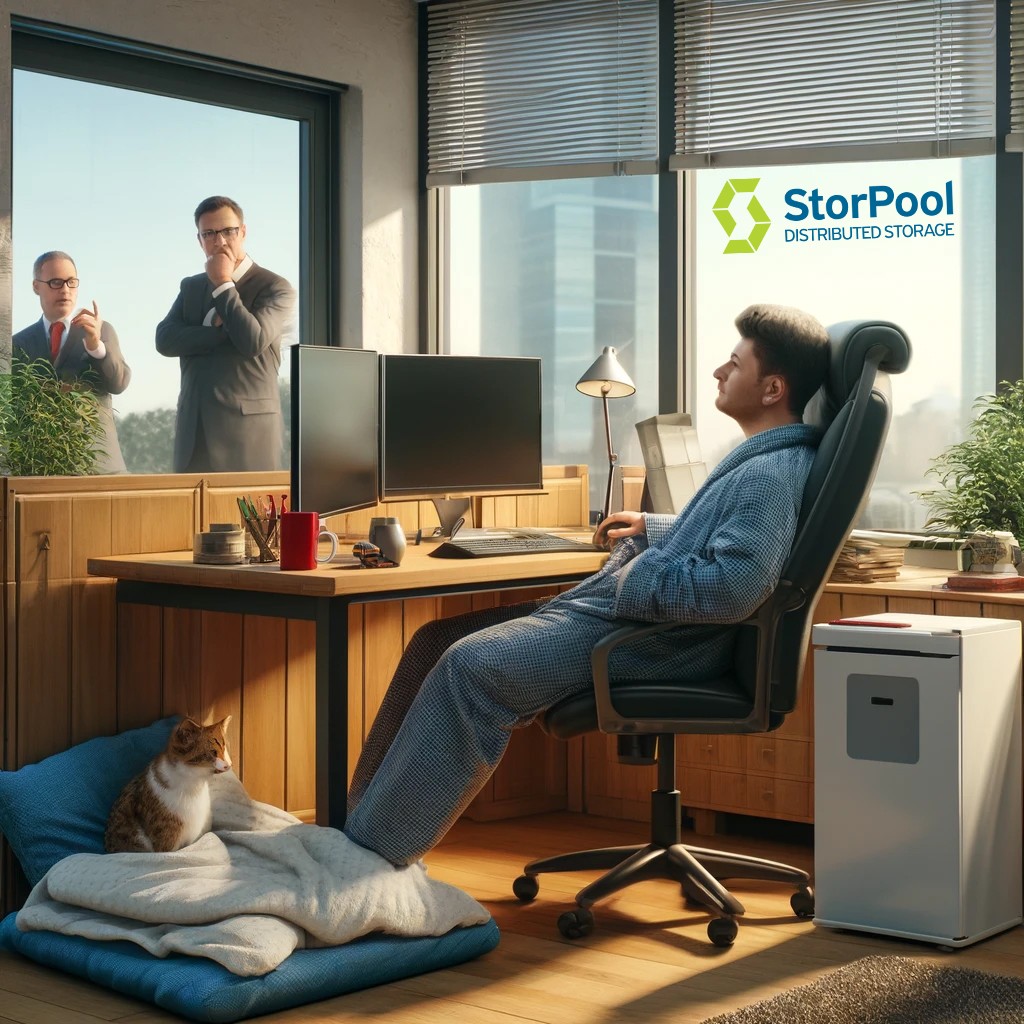 Въпреки че ръководството се опита да намери изход от този парадокс, служителят им предостави още по-добро решение, като започна работа в StorPool Storage, където съвременният интроверт е добре дошъл и лесно може да намери търсения баланс между работната реализация и възможността да я осъществи, докато е облечен в пижама и обут с любимите домашни чехли.