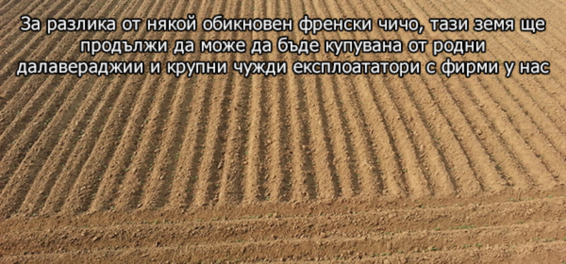По този начин българска земя може да имат всички - българи или не, имащи фирми или измисли някакъв вид схема, която да заобиколи правилата, като единствените без право да закупят земя са няколко обикновени чичовци от Германия и Англия, искащи да се пренесат у нас, където да развиват дребно земеделие.