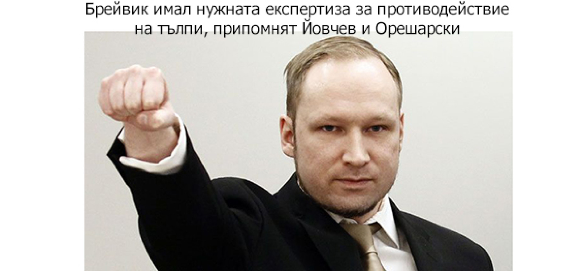"Брейвик има експертизата при справянето с тълпи. Първоначално мислехме да се доверим на Бисер (Миланов - б.а.), но ни трябва специалист от друг калибър" - обясни Орешарски пред силно аплодиращи го протестиращи в полза на правителството активисти, насърчавайки го да избие тези, които искат оставка.