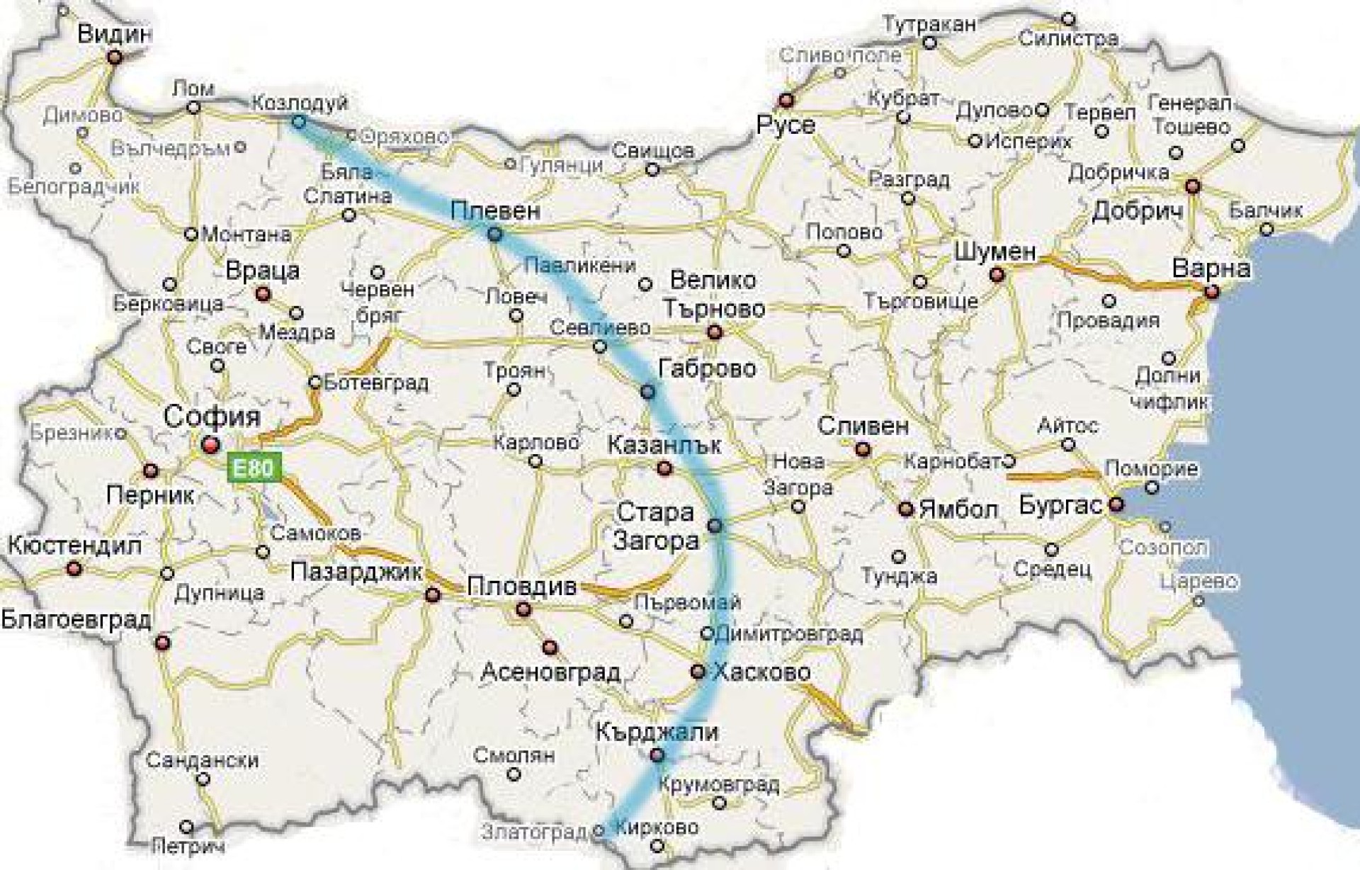 Линията на север започва от дунавския град Козлодуй, после върви в посока югоизток и минава съответно през Плевен, Севлиево, Габрово и Стара Загора, след което завива в посока югозапад и се спуска през Димитровград, Хасково, Кърджали и Златоград, както е показано на примерната карта горе вляво.