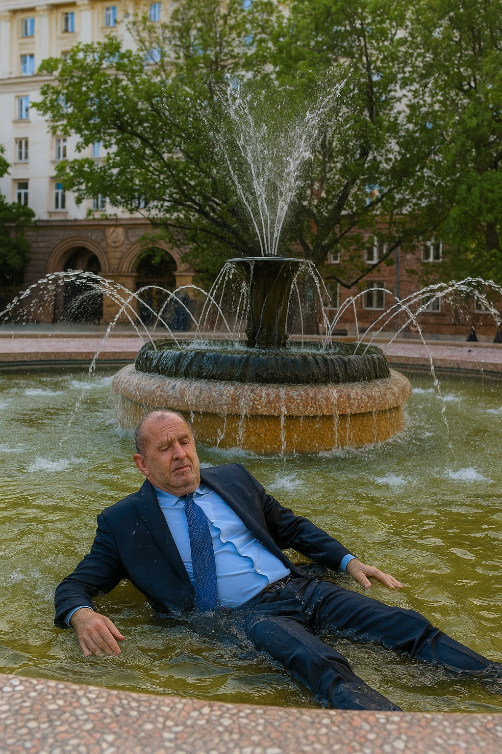 За щастие държавният глава е паднал във фонтана пред президентството, след като се е изтърколил през задната седалка на кабриолет на бивш енергиен служебен министър.