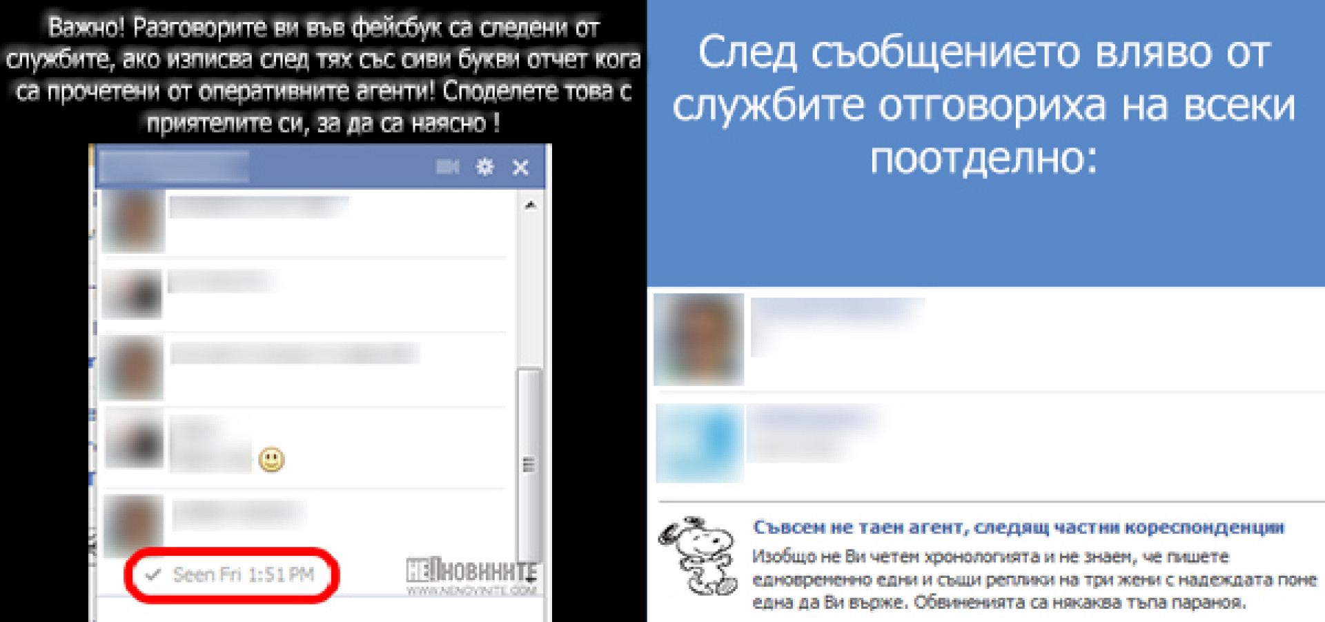 В популярната платформа за информационен обмен стана широко популярно съобщението, че индикаторът за прочит от страна на адресата на съобщенията, всъщност показва, че кореспонденцията е проследена от дежурен агент. (лявата половина на картинката горе)