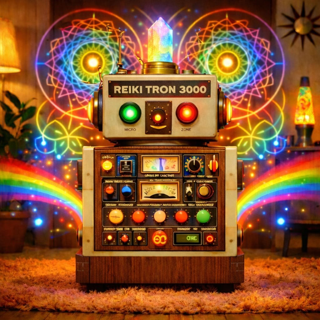 Произведен в Рейкявик, сглобен от две решителни кутии, една самоуверена антена и повече копчета, отколкото човечеството е поискало, REIKI TRON 3000 е първата машина, която не чисти прах - тя чисти вибрации.